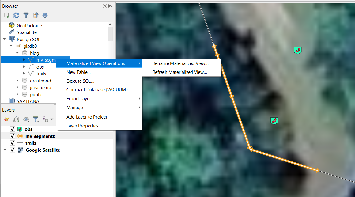 Figure 2. Little contextual flyout menu on the materialized view in Qgis allowing me to refresh it right from the comfort of my GIS. Qgis and PostGIS were kinda born together and have grown up together. Nice touch Devs!