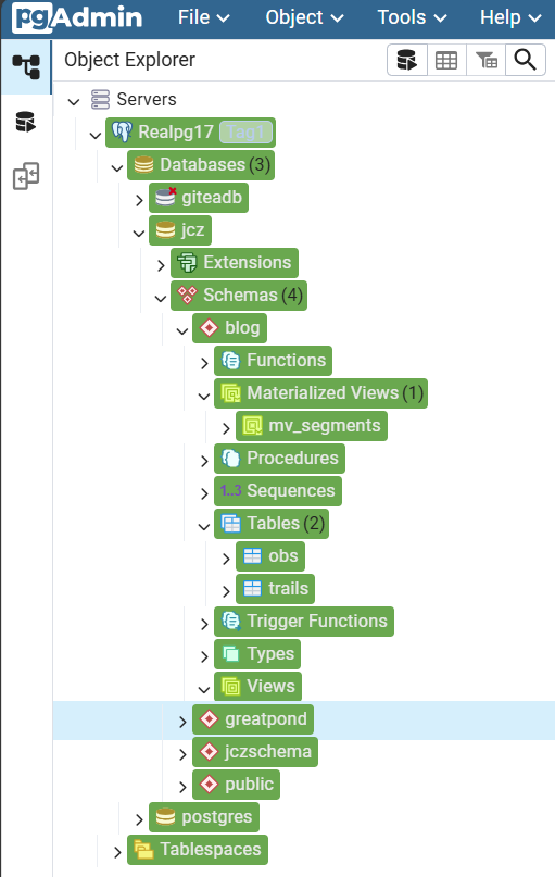 Figure 3. A slimmed down navigation pane from pgAdmin4 showing jcz/blog/mv_segments as database/schema/materialized view respectively.
