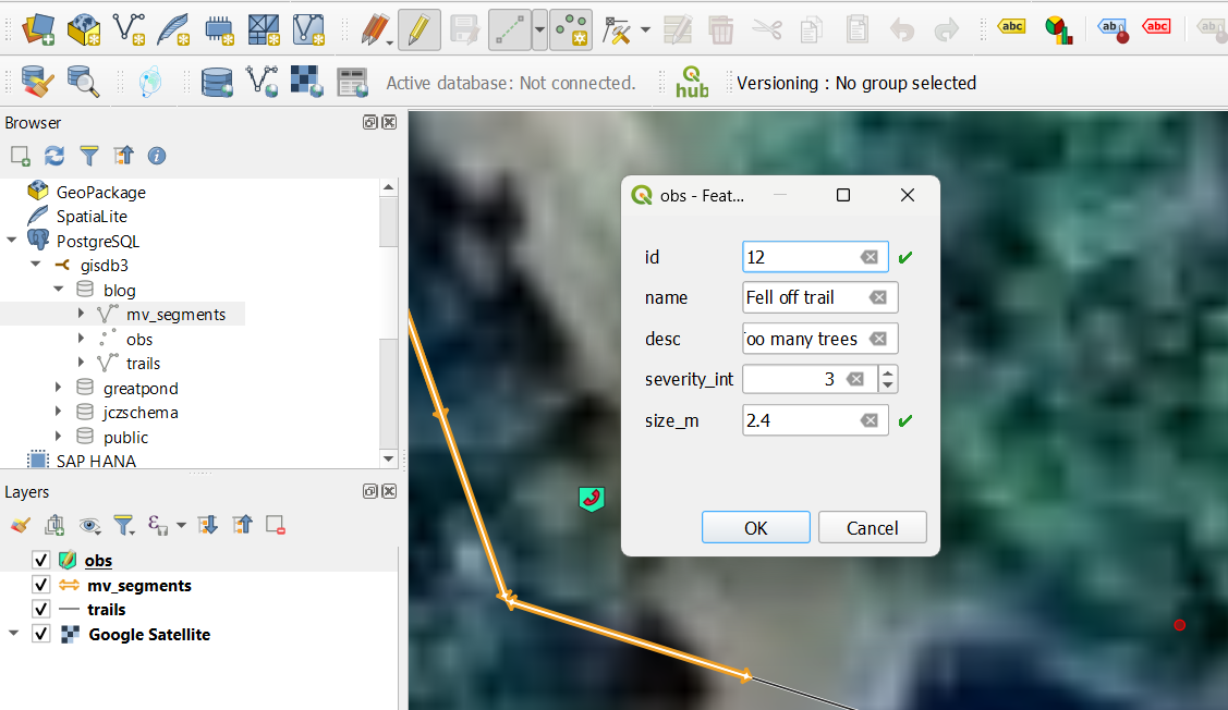Figure 1. The basic entities we describe above. The top panel shows the blog schema with the resulting mv_segments materialized view with linstring outputs in it, and the inputs: obs point geometry table in PG and trails linestring table. These each correspond to their layers shown in the layer browser and the map. I’m on a new computer I had to restart on my symbologies (is there a way to share collections of Qgis synbols between computers?)