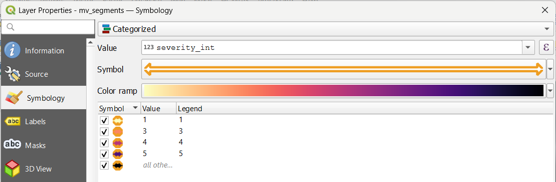 Figure 8. Updated the map view to demonstrate the new symbology and label the segments to prove we’re showing the severity integer value.